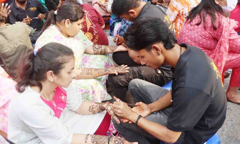पलटन बाजार में सुहागिनें मेहंदी लगवाने के लिए सुबह से ही कतारों में नजर आईं। इस बार थ्रीडी मेहंदी की मांग सबसे अधिक रही। मेहंदी कलाकार सुबह से देर शाम तक व्यस्त रहे।