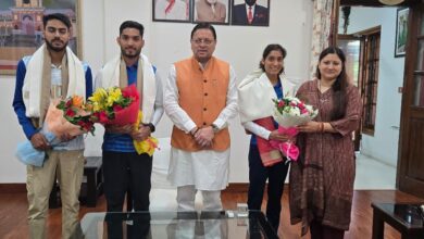 मुख्यमंत्री पुष्कर सिंह धामी से मंगलवार को मुख्यमंत्री आवास में पेरिस ओलिंपिक में प्रतिभाग कर लौटे खिलाड़ियों अंकिता ध्यानी, परमजीत सिंह एवं सूरज पंवार ने भेंट की।