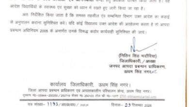 ऊधमसिंह नगर: जिले में मौसम और अन्य परिस्थितियों को देखते हुए प्रशासन ने एहतियाती कदम उठाते हुए बड़ा निर्णय लिया…