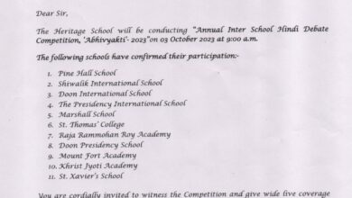 देहरादून द हैरिटेज स्कूल के तत्वावधान में एनवल इंटर स्कूल हिन्दी डिबेट कम्पिटीशंस अभिव्यक्ति 2023 का आयोजन तीन अक्टूबर को…