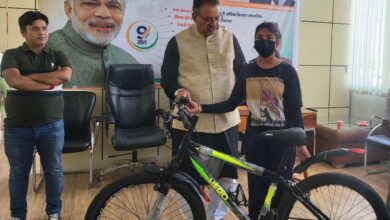वुशु खिलाड़ी आयशा चौहान को साइकिल भेंट करते कैबिनेट मंत्री गणेश जोशी
