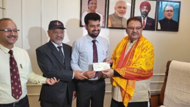 वन्दे मातरम ट्रेनिंग एण्ड एजुकेशन फाउण्डेशन के संस्थापक पूर्व सैनिक राजेश सेमवाल को 02 लाख का चेक भेंट करते सैनिक कल्याण मंत्री गणेश जोशी