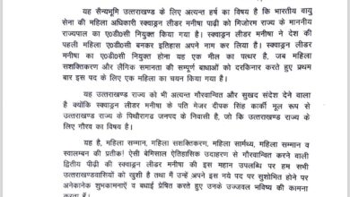 भारतीय वायु सेना की महिला अधिकारी स्क्वाड्रन लीडर मनीषा को मिजोरम के राज्यपाल का ए०डी०सी नियुक्त होने पर सैनिक कल्याण मंत्री गणेश जोशी ने दी बधाई