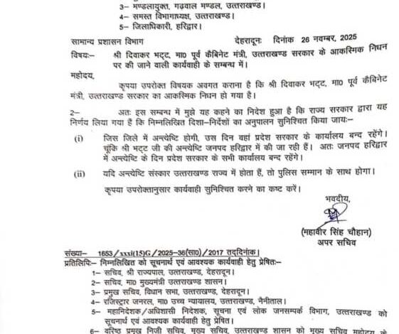 दिवाकर भट्ट के सम्मान में सरकारी कार्यालयों में निर्धारित मानकों के अनुसार शोक प्रोटोकॉल लागू करना।