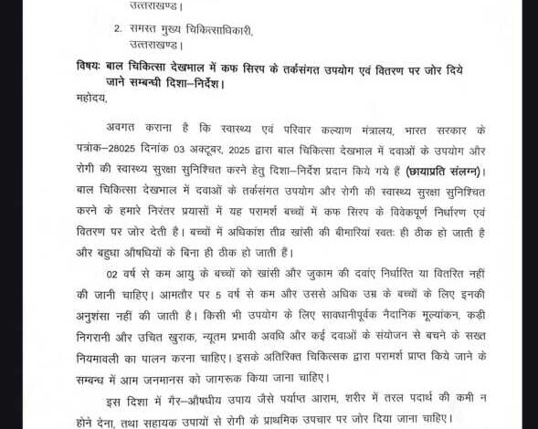 भारत सरकार के स्वास्थ्य एवं परिवार कल्याण मंत्रालय द्वारा 3 अक्टूबर 2025 को जारी एडवाइजरी के अनुपालन में राज्य में भी बच्चों में कफ सिरप के विवेकपूर्ण उपयोग और वितरण पर विशेष बल दिया गया है।