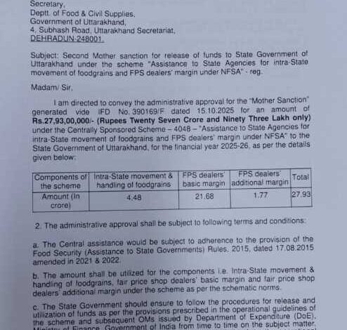 देहरादून, 15 अक्टूबर: प्रदेश के राशन विक्रेताओं के लिए अच्छी खबर है। केंद्र सरकार ने उत्तराखंड को राशन विक्रेताओं के बकाया लाभांश और भाड़े के भुगतान के लिए 27 करोड़ 93 लाख रुपये जारी किए हैं।