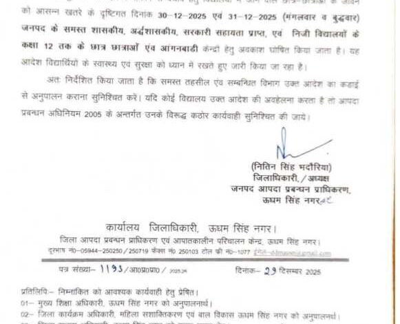 ऊधमसिंह नगर: जिले में मौसम और अन्य परिस्थितियों को देखते हुए प्रशासन ने एहतियाती कदम उठाते हुए बड़ा निर्णय लिया है। जिलाधिकारी के आदेशानुसार मंगलवार और बुधवार को ऊधमसिंह नगर जिले के सभी स्कूलों और आंगनबाड़ी केंद्रों में अवकाश घोषित किया गया है।